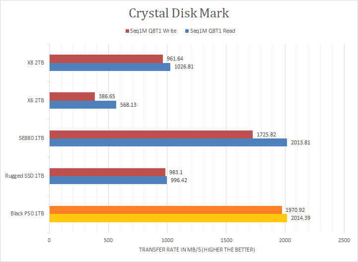 From here, you can see the Western Digital Black P50 Game Drive SSD 1TB reached its peak results at 2014.39MB/s read and 1970.92MB/s write.