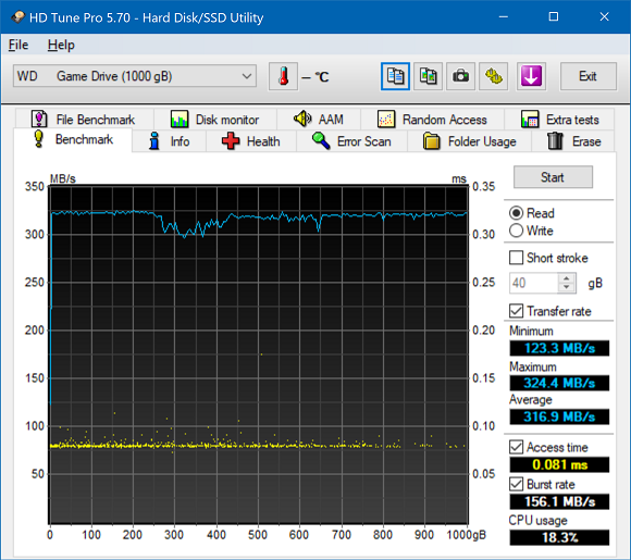 Unfortunately, HD Tune does not generate any fancy independent graph outputs in particular, so I just took a screenshot of the program. The Western Digital Black P50 Game Drive SSD 1TB remained flat on average. It differed slightly in magnitude than HD Tach -- probably due to testing algorithms used -- but its performance characteristics were identical in practice. Other than that, the results were top tier across the range; the recorded access time was very low as we would expect from an external solid state drive. Our Western Digital Black P50 Game Drive SSD 1TB gave us an average number of 316.9MB/s. Compared to our three other NVMe-based external storage options, this is faster than the SL100 Pro 500GB at 241.3MB/s, but slower than the Crucial X8 1TB at 327.5MB/s and LaCie Rugged SSD 1TB at 367.3MB/s. The tested latency was a bit different compared to AIDA64 and HD Tach at 0.081ms. Do keep in mind the discussion we had on the previous page, as it still applies here.
