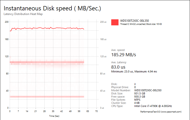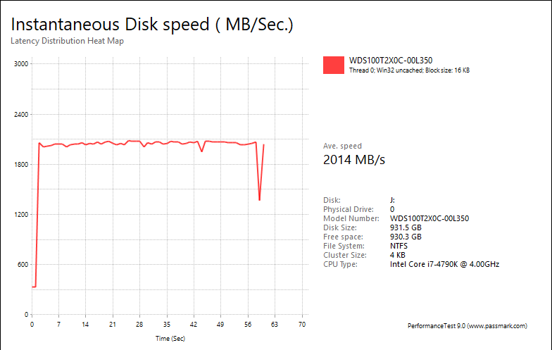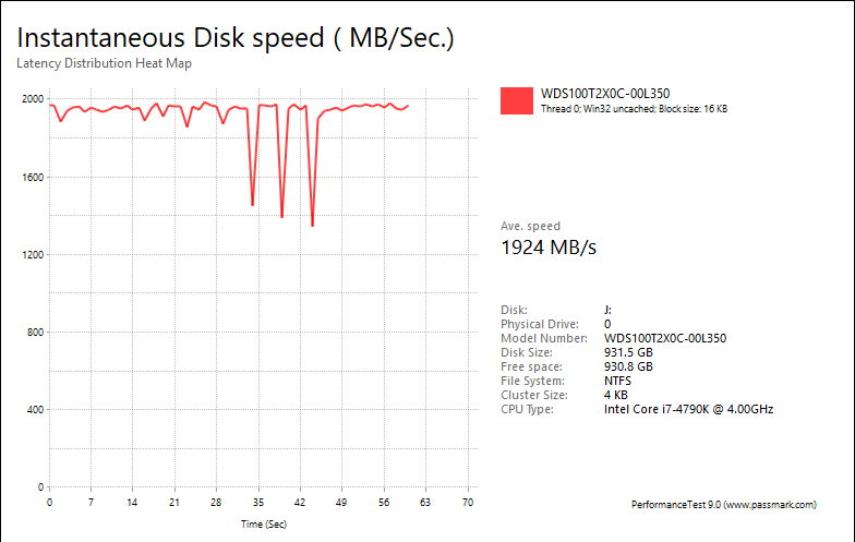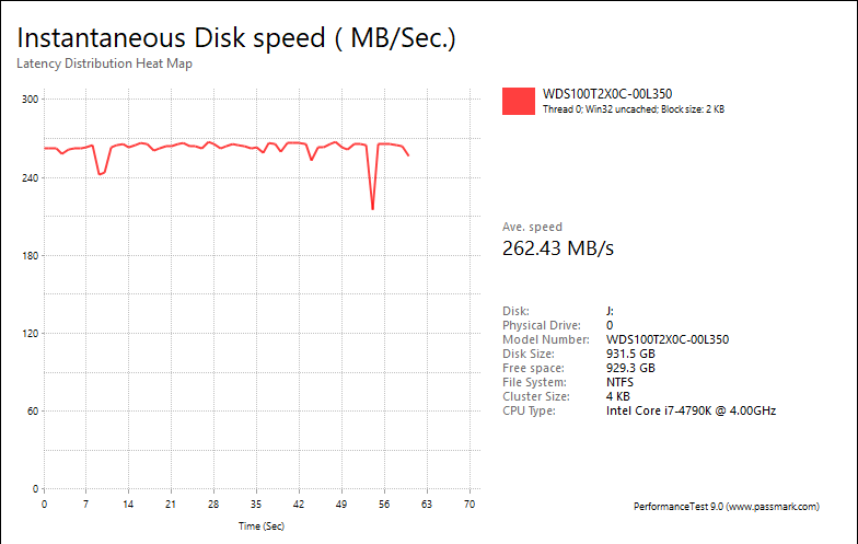 PassMark PerformanceTest 9.0's Advanced Disk Test, unlike HD Tune Pro 5.70, generates some awesome graphs right out of the box. It also provides valuable insight in simulating real world performance applications. To make things clear to you, the first graph simulates a database server, followed by a file server, web server, and workstation. Obviously, PassMark PerformanceTest 9.0 uses highly compressible data in most tests some controllers can really take advantage of. However, it also requires high IOPS capabilities for the best score. In the past, Marvell and Indilinx based drives perform pretty well in this test. One thing clear is the Western Digital Black SN750 NVMe SSD 1TB provided very flat graphs, which is excellent if you are looking for consistent performance.