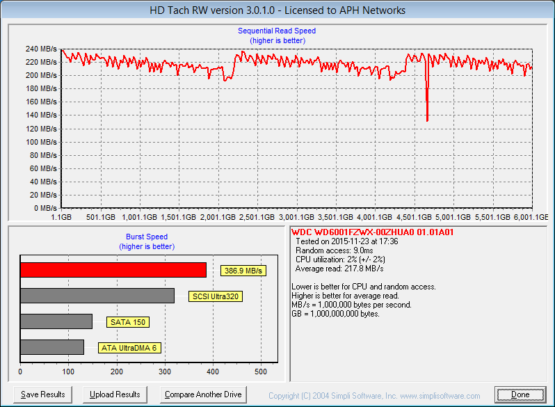 Now, it is the time for good old HD Tach. While HD Tach is more of a 'drag race' than a clear indication of real life performance, and has been around for a really long time, it is an excellent storage performance reference between hard drives for more than the last decade. Back in the days, if your average speed exceeded 60MB/s, you have a seriously fast drive. Where does the Western Digital Black WD6001FZWX 6TB come in? With an average read speed of 217.8MB/s, and tested random access time of 9.0ms, this is mind-blowingly fast for a mechanical hard drive. But how does it compare against the competition? The 7,200RPM Deskstar NAS 4TB came in at 158.0MB/s, while the Red Pro WD4001FFSX dropped in at 166.5MB/s. For other 6TB drives, the Red Pro WD6001FFWX clocked in at 227.6MB/s, and the Red WD60EFRX pulled 176.5MB/s in the same test. Again, it was slightly behind the WD Red Pro 6GB in linear tests like this, as we have seen on previous pages, but undoubtedly incredibly fast by 2015 standards.