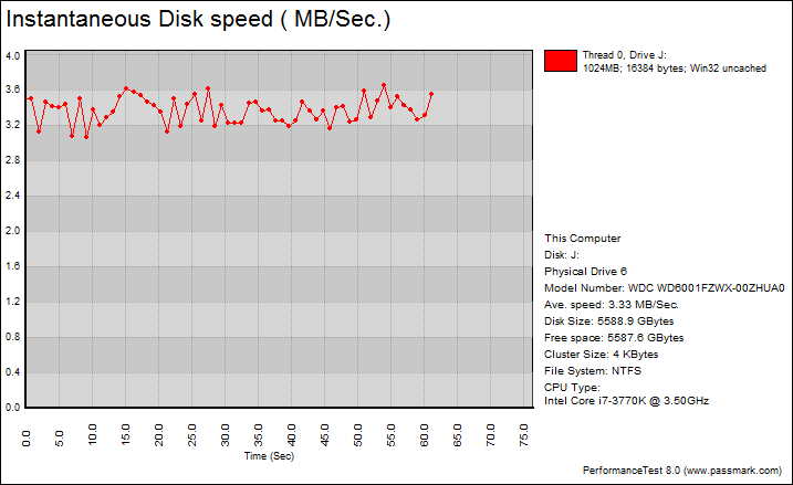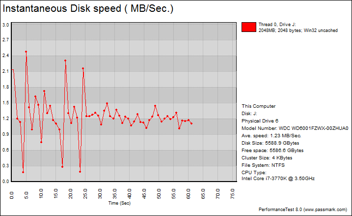 Overall, the Western Digital Black WD6001FZWX 6TB's performance was excellent compared against other hard drives. With results of 1.23MB/s, 9.10MB/s, 9.74MB/s, 3.33MB/s, this is better than any drive we have ever tested here at APH Networks. Just for reference, the 5,900RPM Seagate Desktop SSHD had a score of 0.98MB/s, 7.28MB/s, 6.29MB/s, 3.10MB/s, respectively; while the 5,400RPM Western Digital Blue SSHD came in at 0.90MB/s, 7.22MB/s, 8.09MB/s, 2.95MB/s, in the same order. The only other drive that was able to compete against the WD Black 6TB was the WD Red Pro 6TB, which posted numbers of 1.24MB/s, 8.91MB/s, 9.88MB/s, and 3.36MB/s, respectively.