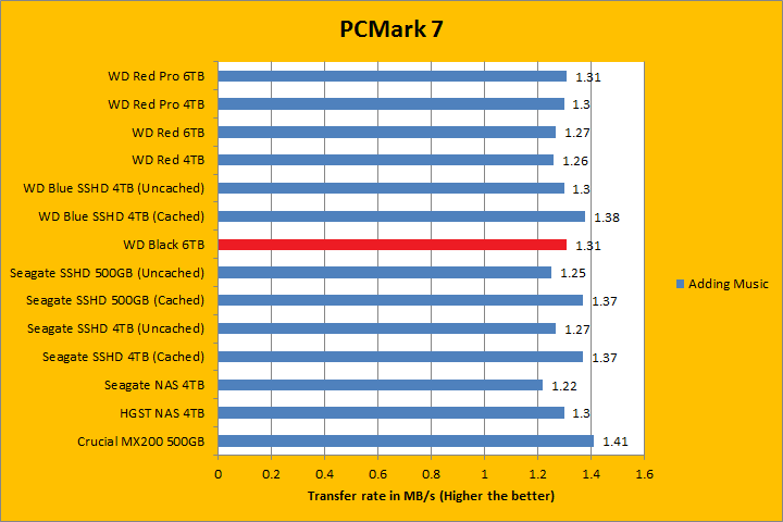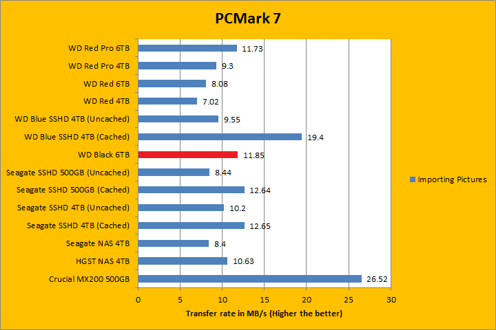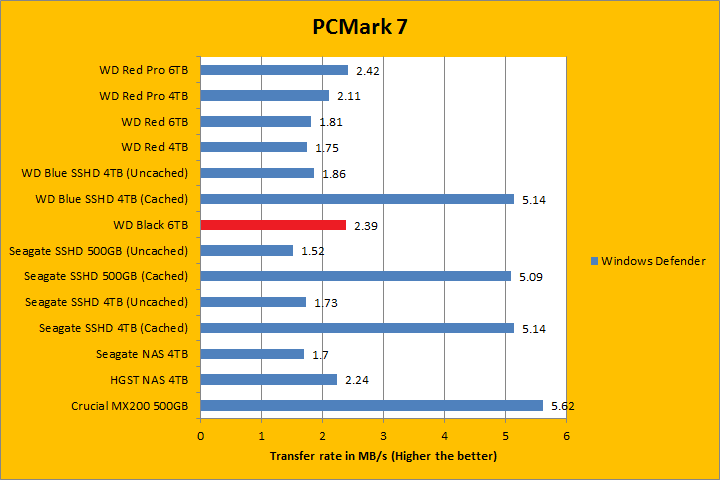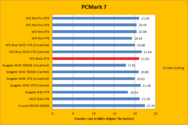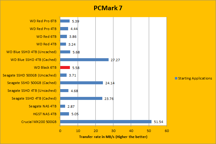 PCMark 7 aims to shed a little more insight into real life performance of your computer hardware by semi-synthetic means -- and all insight is good, right? The great thing about standardized tests is anyone can repeat them and get very similar results, given identical hardware. PCMark 7 is a Windows desktop environment based test, which is exactly what we are after. Also, we can see some caching going on between iterations, which allowed us to see what kind of boost some of the SSHDs in this test brings to the table. Well, I am not going to narrate the stuff above in detail, because we all know graphs are there for a very good reason. As you can see in our results above, the WD6001FZWX was clearly the fastest pure mechanical hard drive in the overall score. It consistently held its own or was among the top against other hard drives in each simulation segment, which was very impressive. It even managed to marginally outperform the WD Red Pro 6TB -- good news for the WD Black 6TB -- considering it was designed for desktop usage, after all.