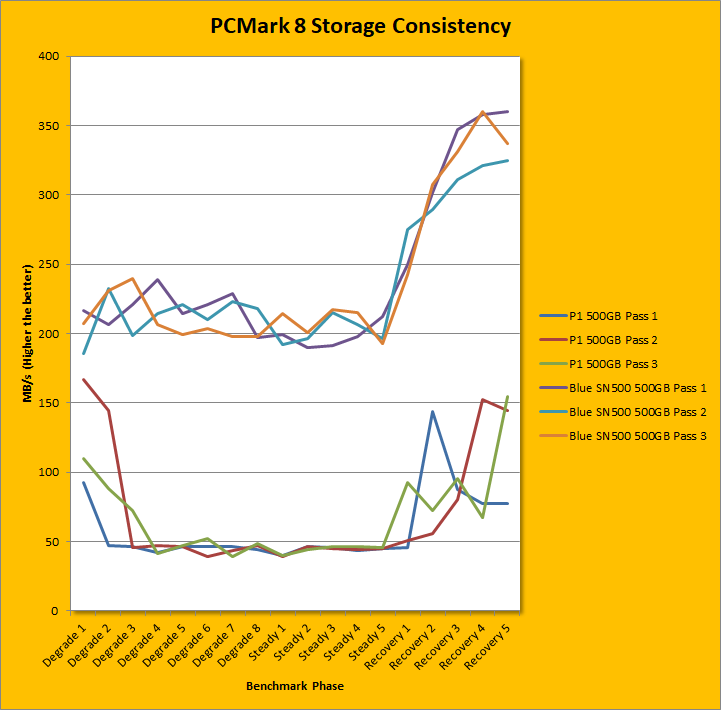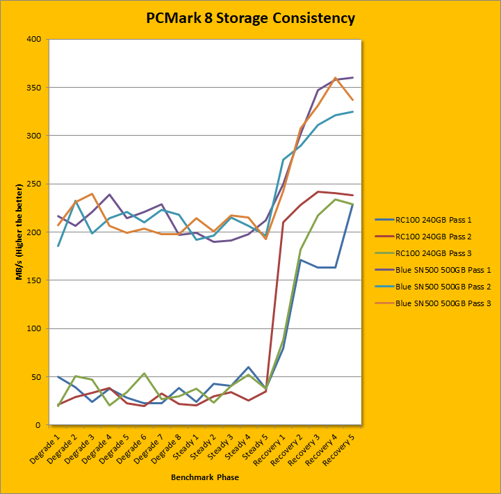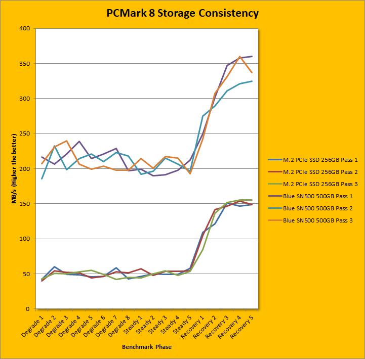 PCMark 8 Storage Consistency Test is one of our favorite benchmarks, but also one of the more taxing ones too. Nowadays, many drives are well optimized for high benchmark scores when they are empty, but what separates the professional players from the amateurs is how it stands up to a truly punishing workload. PCMark 8's Storage Consistency Test is designed exactly for this purpose. Going through five phases -- precondition, degradation, steady state, recovery, and clean up -- to extend beyond real world application simulations, this benchmark takes around two days to complete, but the results are revealing of a SSD's true capabilities.