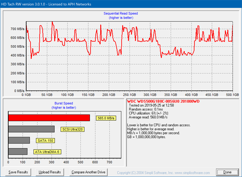 After giving the Western Digital Blue SN500 NVMe SSD 500GB a clean format and ensuring alignment and everything is correct, I fired it up for some testing in HD Tach. HD Tach is more of a drag race than a clear indication of real life performance and has been around for a really long time. It is an excellent storage performance reference among SSDs with the same controller, and has been our favorite benchmark long before hard drives even cracked the 50MB/s mark. With an average read speed of 560MB/s according to HD Tach in single disk configuration, this score was average in this class. Compared to the Toshiba RC100 240GB, this drive was still much slower and even slightly slower than the Gigabyte M.2 PCIe SSD as well. The Western Digital Blue SN500 NVMe SSD 500GB burst speed rating was also average at 560MB/s. Do keep in mind, this is still faster than most SATA-based SSDs, like the Crucial MX500 500GB, though not by a whole lot. At the end of the day, HD Tach may not be the best test for solid state drives all the time, but these results are always interesting to look at.