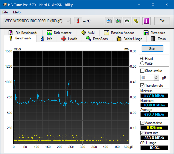 Unfortunately, HD Tune does not generate any fancy independent graph outputs in particular, so I just used a screenshot. Like our HD Tach results on the previous page, the line was a bit bumpy, but remained fairly flat on average. It differs slightly in magnitude than the other program -- probably due to testing algorithms used -- but its performance characteristics are identical in practice. Other than that, the results were similar across the range; the recorded access time was very low, as we would expect from a solid state drive. The Western Digital Blue SN500 NVMe SSD 500GB posted an average of 680.7MB/s for its sequential read speed. Do keep in mind the discussion we had on the previous page, as it still applies here.
