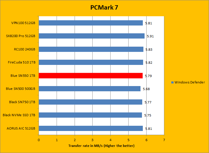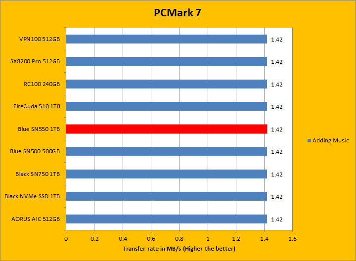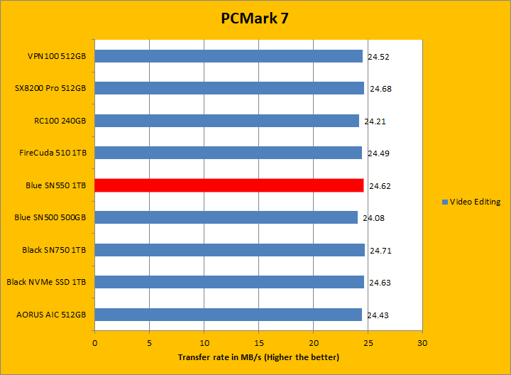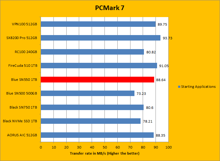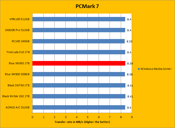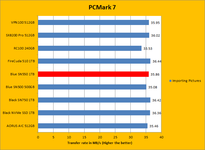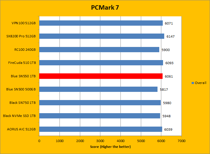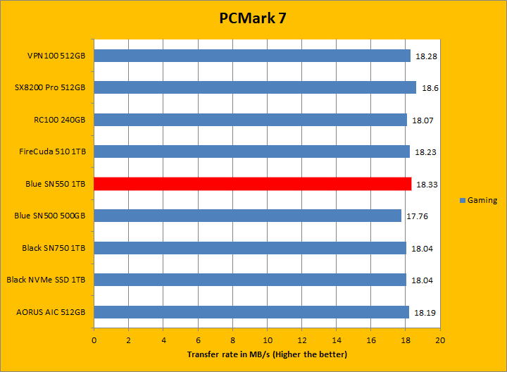 PCMark 7 aims to shed a little more insight into real life performance of your computer hardware by semi-synthetic means -- and all insight is good, right? The great thing about standardized tests is anyone can repeat them and get very similar results, given identical hardware. PCMark 7 is a Windows desktop environment-based test, which is exactly what we are after. I am not going to narrate the stuff above in detail, because we all know graphs are there for a very good reason. Just to give you a bit of insight if you are too lazy to go through all eight comparisons, the Western Digital Blue SN550 NVMe SSD 1TB came in fourth place overall, beating out all other Western Digital SSDs by a very small margin. For the most part, it was in the middle of the results for most of these tests, with it only standing out in the Gaming test. PCMark 7 uses some pretty simple simulations, so it is optimized for drives with relatively fast linear read.