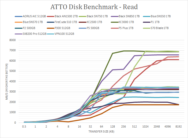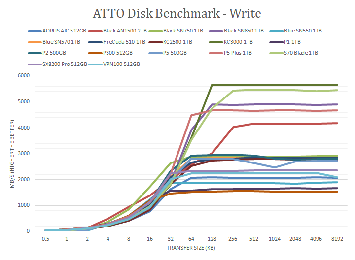 The next tests are our usual ATTO read and write tests. ATTO is an often-quoted benchmark because it is easy to use and accurate. For the most part, it is a favorite among reviewers and I have grown to embrace it as much as the next for the last little while. ATTO uses easily compressible data, so compression-heavy controllers will perform very well here. As far as the in-house Western Digital controller on the SN570 1TB is concerned, well, here are our results. It peaked at 2843MB/s write and 3288MB/s read. These are both slightly below the quoted maximum speeds, but still quite good. Under the curve, the SN570 traded blows with the older SN550 at smaller packet sizes, but pulled ahead once it reached 32K and higher. In the read test, the SN570 was practically, on all counts, improved from the SN550, in both its peak and under the curve. Compared to the SN750, the last WD Black PCIe 3.0 drive we reviewed, we once again see blows traded in the write tests under the curve, although the SN750 has a higher peak. The read test comparison shows a similar story as well. Even so, these are impressive numbers from the SN570 when you consider its budget nature.