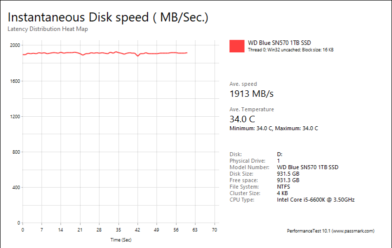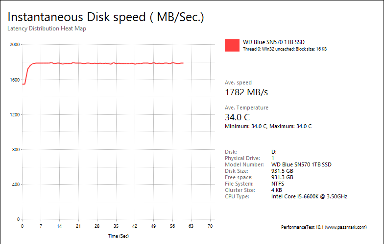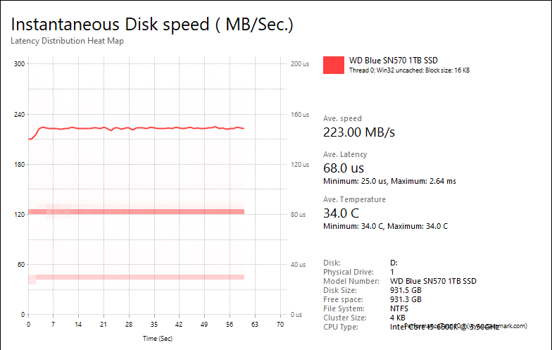 Overall, this is one test where the Western Digital Blue SN570 NVMe SSD 1TB put up impressive numbers for a budget model. With results of 244.36MB/s, 1782MB/s, 1913MB/s, and 223MB/s, the WD Blue SN570 1TB put up numbers faster than some PCIe 4.0-based drives. This includes the Kingston KC3000 1TB, which had numbers of 149.62MB/s, 1295MB/s, 1403MB/s, and 251.88MB/s, the SN850 1TB at 153.57MB/s, 1191MB/s, 1236MB/s, and 243.03MB/s, and the XPG Gammix S70 Blade 1TB at 151.08MB/s, 1336MB/s, 1458MB/s, and 197.86MB/s. Interestingly enough, the PCIe 3.0-based SN750 1TB came in at 262.43MB/s, 1924MB/s, 2014MB/s, and 185.29MB/s, respectively, which is faster in three of the four tests. The Kingston KC2500 1TB posted results of 215.52MB/s, 1261MB/s, 1607MB/s, and 201.03MB/s, in the same corresponding order.