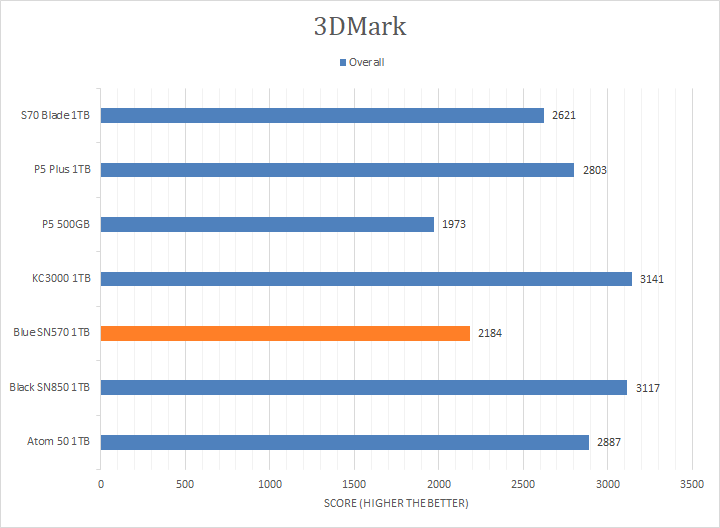 As the newest test in our suite of benchmarks, you can see the Western Digital Blue SN570 NVMe SSD 1TB was among the lower scoring drives, although it is a bit of an unfair comparison since the majority of the other ones are PCIe 4.0-based NVMe options. In some specific tests, like the loading of games, the SN570 was faster than some expectedly faster drives, like the XPG Gammix S70 Blade 1TB. Even so, these differences are small and the overall numbers still show a notable margin between the two classes of solid state drives. When we look at the only other PCIe 3.0 option on this list, the Crucial P5 500GB, we can see the WD Blue SN570 provided a 10% higher overall score than the P5, with it winning in six of the seven tests. In fact, the only test the SN570 performed worse was the Game Move test, which could signify a reduction in speed due to the DRAM-less nature of the SN570 and the SLC cache filling up while copying a large folder into the drive. Otherwise, the SN570 still performed similarly in these tests as it did in the benchmarks for PCMark 10.