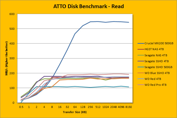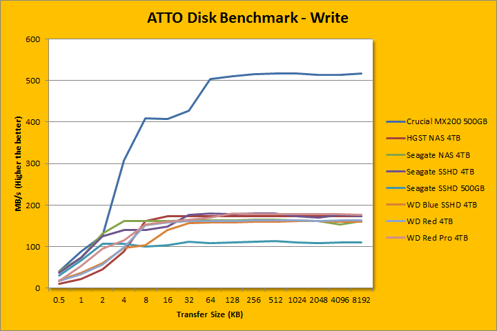 Following up next is our usual ATTO read and write tests. ATTO is an often quoted benchmark, because it is easy to use and accurate. For the most part, it is a favorite among reviewers, and I have grown to embrace it as much as the next for the last little while. By varying the file transfer size, you can visually see how each product performs across the curve. It does not exactly cache ATTO data either, but I am seeing some small inconsistencies between runs. As such, I took the most consistent run, and used it for our results today. In the Read section, the Western Digital Blue SSHD WD40E31X 4TB followed a pattern quite similar to the Red 4TB. Its ramp up speed was not as fast as the Seagate Desktop SSHD, which was the fastest we have tested here at APH Networks. The Western Digital Blue SSHD reached maximum performance at 16K and above, which is fairly normal for a storage device. Its peak rate came in at 166.808MB/s, which was about 10MB/s lower than the Seagate Desktop SSHD. Compared to the Crucial MX200 SSD's 516.222MB/s statistic, you can park a Boeing 747 in between, but it remained relatively competitive in the sea of desktop hard drives. In the Write section, it also reached its peak rate at 16K and above. With a top write speed of 160.739MB/s in uncached mode, this was pretty good for a 5,400RPM desktop hard drive with 1TB platters, but again, behind the Seagate Desktop SSHD's peak rate of 179.958MB/s.