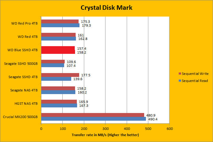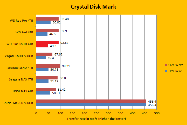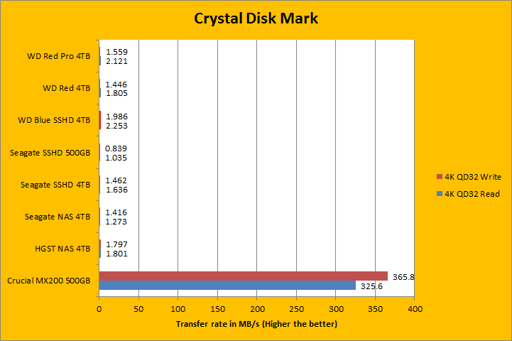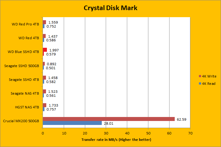 Crystal Disk Mark 3.0 is in the spotlight. Crystal Disk Mark is an important benchmark, because it tests the input/output operations per second capability of the storage device. As you can see in our charts above, compared against a few select drives; namely, hard drives from HGST, Seagate, and Western Digital, along with a mainstream MX200 500GB SSD from Crucial, the 5,400RPM Western Digital Blue SSHD WD40E31X 4TB was quite in line with my expectations. Crystal Disk Mark does not account for caching, so it was obviously no contest against the Crucial SSD. For a drive of this caliber, these results were what I was anticipating in the sequential and 512K sections, where it was reminiscent of the Red 4TB, another 5,400RPM drive with four 1TB platters. Like all HDDs in the presence of an SSD, it was blown away in the 4K and 4K QD32 results. That said, the WD40E31X posted some great results in these areas compared to other mechanical disks; delivering a noticeable advantage over the Seagate Desktop SSHD. I will let you take a look at the results in our comparison graphs above.