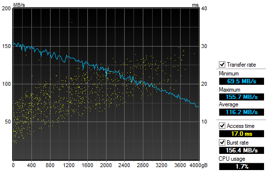 Unfortunately, HD Tune does not generate any fancy independent graph outputs in particular, so I had to edit my screenshot out a bit to make it look better for publishing in a review. Someone unlike our HD Tach results on the previous page, the line was standard fare for a hard drive -- faster near the beginning, and slowly drops off as we move away from the center of the platter. It differed slightly in magnitude than the other program as well -- probably due to testing algorithms used -- but its performance characteristics is really identical in practice. Other than that, the results were commendable across the range for a drive of this caliber; peaking at 155.7MB/s and holding a minimum of 69.5MB/s. Do keep in mind the discussion we had on the previous page, as it still applies here.