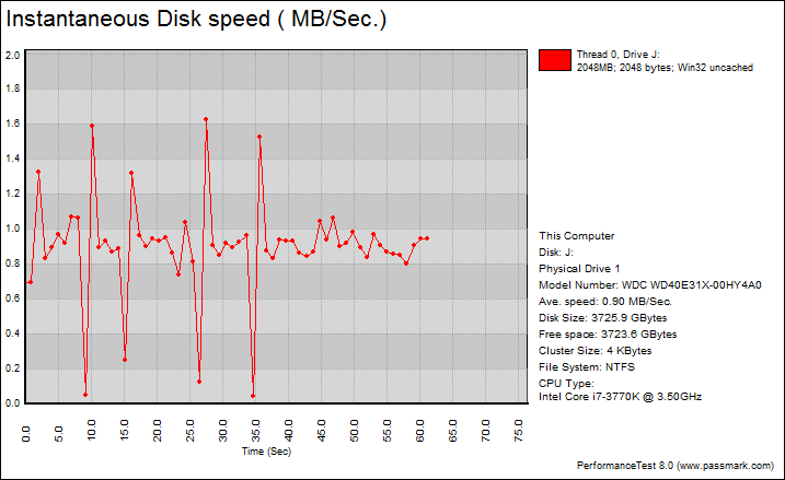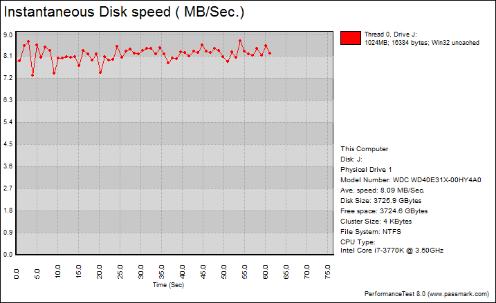 PassMark PerformanceTest 8.0's Advanced Disk Test, unlike HD Tune Pro 4.60, generates some awesome graphs right out of the box. It also provides valuable insight in simulating real world performance applications. To make things clear to you, the first graph simulates a database server, followed by a file server, web server, and workstation. Drives with high sequential read and write performance will do well in PassMark PerformanceTest 8.0. However, it also requires high IOPS capabilities for the best score, and as such, results for hard disk drives will prove to be very relevant.