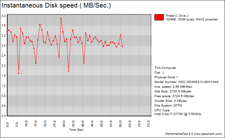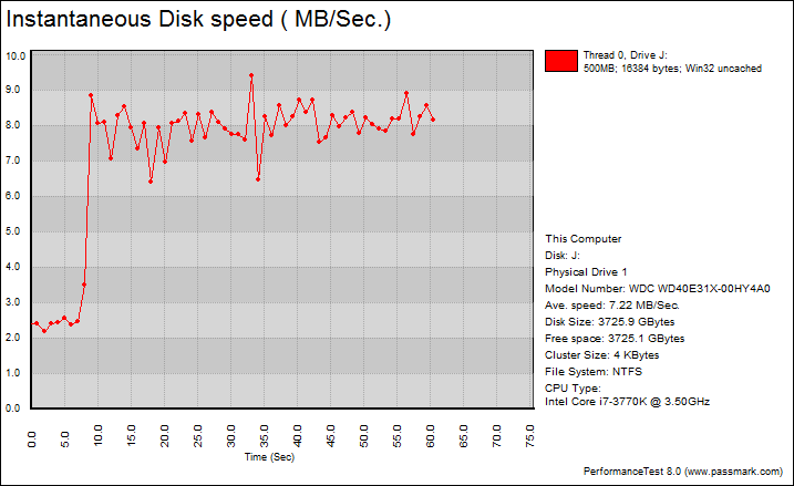 This Advanced Disk Test, which is part of PerformanceTest, measures the data transfer speed when reading or writing data to one or more disks. The speed that data can be transferred between memory and a hard disk drive is one of a system's most important performance aspects. There are quite a few factors which have a bearing on this speed and the Advanced Disk Drive Test allows the user to vary most of these factors and compare the results.