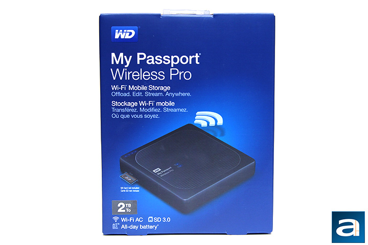 The retail box design for the Western Digital My Passport Wireless Pro 2TB is business as usual. The company's classic blue gradient background surrounds all faces of the box. In front, you will find WD's logo at the top left corner, followed by the product name and short description of the product in English and French immediately below. A 3/4 angle photo of the My Passport Wireless Pro takes up about a third of the space of the principle side. At the bottom, a 2TB sticker indicates its capacity variant, along with feature highlights such as its WiFi AC adapter, SD 3.0 support, and all-day battery life. Expanded product information can be found on the remaining sides of the box.