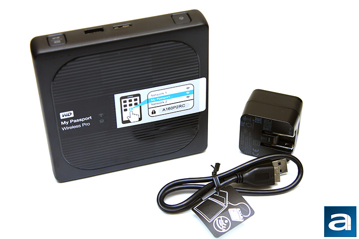 The Western Digital My Passport Wireless Pro 2TB looks nothing like the non-Pro version, but that is okay -- this one packs a lot more punch under the hood. Measuring in at 12.6cm deep, 12.6cm wide, and 2.40cm thick, the Wireless Pro is not exactly pocket size, but nonetheless should fit well in your backpack along with your laptop computer. It tips the scales at exactly one pound. The Wireless Pro's perfectly square enclosure is pretty much all business; the textured matte black plastic at the edges and around the perimeter of the main face of the product ensures scratches and fingerprint marks do not show up easily. In the middle, textured lines that mixes an array of glossy and non-glossy strips forming a square with rounded corners give the My Passport a little bit of visual flare without losing its business vibe. Western Digital's logo and product name can be found on a strip across the center next to a label indicating the SSID of the external hard drive, along with the encryption key. Between the branding and label are two blue LEDs, one for HDD activity and one for wireless status, and both are labeled accordingly with small icons. The WiFi LED stays off when the HDD is off, blinks blue when starting up, connecting to wireless, or shutting down, stays solid blue when wireless network is connected or active, and goes into fast blinking blue when WiFi Protected Setup is initiated and in progress.