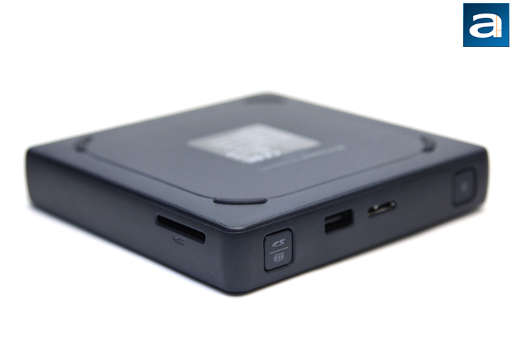 Let us flip the Western Digital My Passport Wireless Pro 2TB around as we take a closer look at the product from another 3/4 angle view. The bottom design is a virtual reciprocal of the top; while not exactly identical, it is shaped accordingly to create a high degree of symmetry. Our photo above shows a standard label nice and center denoting the usual information under the "My Passport Wireless Pro" branding, such as its regulatory certifications, MAC address, serial number, and the fact it is made in Thailand. Moving on, four rubber standoffs are placed at the four corners of the square with rounded corners. The standoffs are quite subtle, but grip pretty well on most surfaces. Unlike the top, the entire bottom is all textured matte black plastic, but not many people look here anyway, haha. In our photo above, you can see the ports and buttons as discussed in the previous paragraph, as well as an SD 3.0 card slot on the side.