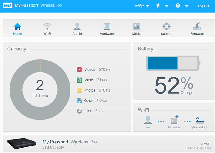 Although the Western Digital My Passport Wireless Pro 2TB is not exactly a network appliance, the set up procedure is pretty similar in nature to most routers and network attached storage systems. To start, turn it on, and connect to your My Passport's WiFi network. Since it is a Wireless AC device, you will see two SSID -- one for 2.4GHz and one for 5GHz -- given you have a dual band adapter, of course. Afterwards, point to the IP address 192.168.60.1 in your internet browser, and the rest is done via a wizard in the web-based interface. The wizard will bring you through a series of simple options like connecting it to your home's WiFi network; all of which can be changed after initialization.