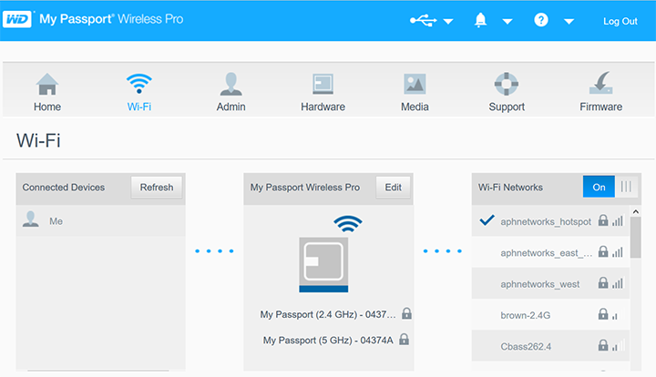 The WiFi tab allows you to configure everything related to the wireless subsystem of the Western Digital My Passport Wireless Pro 2TB. Starting from the left tile, it shows a list of currently connected devices. The middle tile shows configured active WiFi networks. Hitting the Edit button allows you to change things like your SSID, encryption key, IP address of the device itself, as well as WiFi inactivity timeout. The last tile connects your wireless external hard drive to nearby available wireless networks, where you can bridge your device computer through the My Passport to get internet access, or access your wireless hard drive from your wireless network like a regular NAS system.