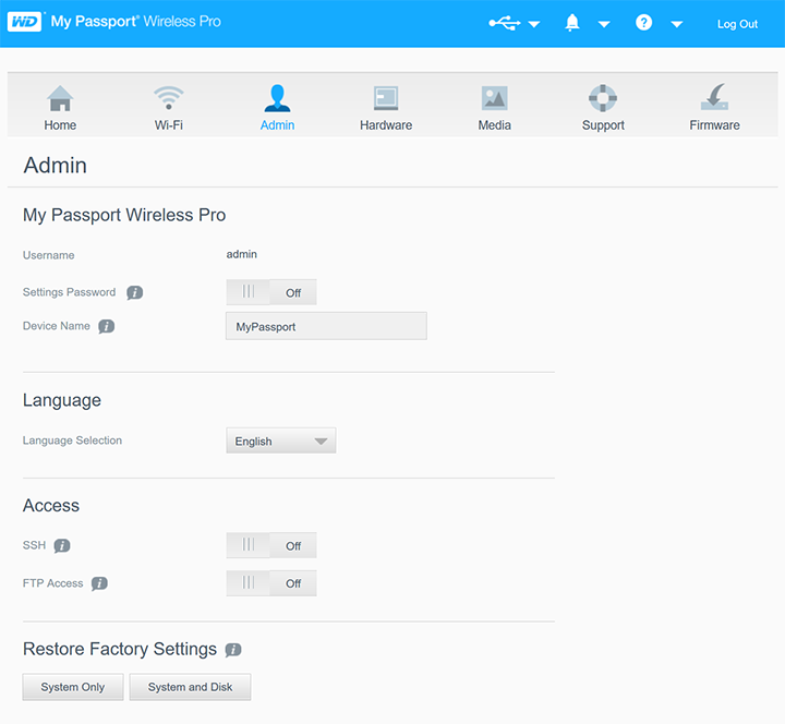 Next up is the Admin page. Everything should be quite self-explanatory here, haha. You cannot change the administrator username, but you can activate a password, as none is set by default, as well as giving your My Passport a more unique name than "MyPassport". Other options include changing the user interface language, toggling SSH and/or FTP on or off, and restore your Western Digital My Passport Wireless Pro back to its default configuration. There are two reset options, as shown in our screenshot above. One changes only the system settings back to default, while the second one clears all your personal data as well. Be careful on which one to choose -- you have been warned, haha.