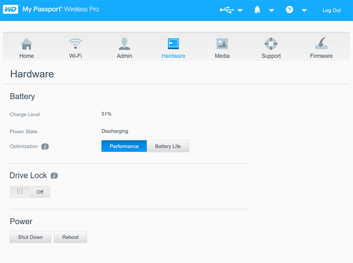 There are not a whole lot of options in the Hardware section of the Western Digital My Passport Wireless Pro's configuration interface. The first subsection pertains to the battery; where it shows the charge level, power state, and an option to choose between Performance and Battery Life for optimization. Selecting Battery Life disables the wireless band when not in use. For most people, Performance is the better way to go, which is also the default selection. Enabling Drive Lock disables direct access via USB. You can still connect via WiFi, and if you have a custom WPA2 encryption key, this means people cannot easily read your data even if they have physical access to your My Passport. You can execute a shutdown or restart here as well.