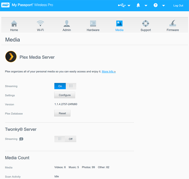 In the Media screen, you can set Plex Media Server and Twonky Server options, as shown in the screenshot above. The Media Count subsection is a database of all videos, music, photos, and other files present on the device. If you want, hitting the Rebuild button -- cut off in the screenshot above -- allows you to rebuild the database should you encounter problems. Below that, you can set automatic import options for SD cards and USB drives; where you can choose between Copy or Move. Copy retains files on the source, while Move does not. All imported files go into a preset folder on your My Passport. Under the USB device subsection, there is one more button, which is Copy Now. As the label on the button suggests, it allows you to... copy the files over now.