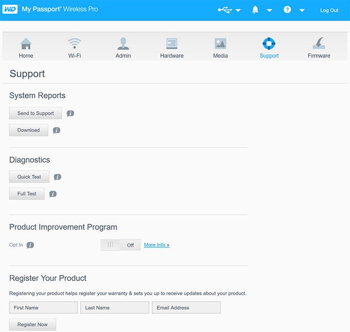 I was going to skip over the Support tab, but there are a few things worth discussing here too, haha. Each option has a little information bubble next to it, where clicking on the information bubbles will provide you with a description of what each option does. System Reports generates a very comprehensive Zip file on all hardware and software configuration and logs, which you can send to support directly, or download for your own perusal. I took a look at what the system reports were, and I do not believe it is designed for the average user to understand. In Diagnostics, you can run a Quick Test or Full Test on your hard drive. Full Test scans for bad sectors, so be sure to plug it in before running, as this may take a few hours.