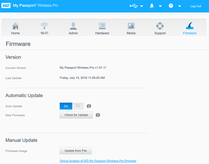 Lastly, we have the Firmware page. As you can see in our screenshot above, here, you will find the current firmware version and last update time. You can also toggle automatic updates on or off, as well as initiating a check for new firmware manually. Automatic firmware update works well from my experience; it ran flawlessly when I first fired up my Western Digital My Passport Wireless Pro 2TB. If automatic updates are not your thing, you can upload a file manually. A link to Western Digital's website containing firmware files for the Wireless Pro is conveniently included.