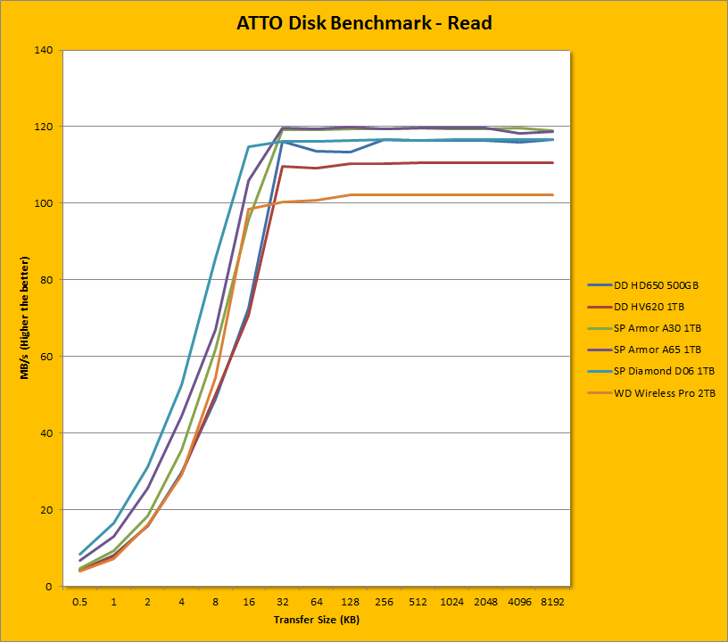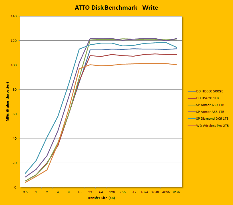 Following up next is our usual ATTO read and write tests. ATTO is one of my favorite benchmarks for quite a while. Ever since we have started using it in my network attached storage reviews a few years ago, it has been integral to our battery of storage performance evaluations here at APH Networks -- mainly due to its accuracy, and thorough testing in accordance to varying transfer sizes. As you can see in our graphs above, the Western Digital My Passport Wireless Pro 2TB's read performance and write performance was roughly the same; peaking at 102.261MB/s and 101.487MB/s, respectively. Under the curve, the My Passport Wireless Pro reached maximum performance for everything 16K and above. The ramp up speed also either tied for last or trailed the majority of the competition. As we move to larger transfer sizes, WD's wireless hard drive in USB 3.0 mode trailed the pack by 15 to 20MB/s, as demonstrated in the posted comparison charts.