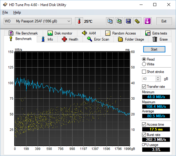 Unfortunately, HD Tune does not generate any fancy independent graph outputs in particular, so I only took a screenshot of the program to publish in this review. Again, like our HD Tach results on the previous page, the line reflected that of a standard hard drive as before, just like how it was supposed to be. It differed slightly in magnitude than the other program -- probably due to testing algorithms used -- but its performance characteristics were identical in practice. The average worked out to 80.5MB/s; with a peak of 108.4MB/s and minimum of 48.0MB/s. These figures were, once again, sufficiently close to other USB 3.0 hard drives we have tested on this website, even if it trailed them all slightly. The Western Digital My Passport Wireless Pro 2TB's tested latency was also generally consistent with what we have seen in AIDA64 and HD Tach.