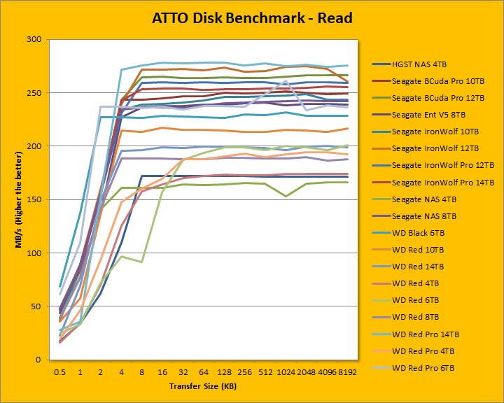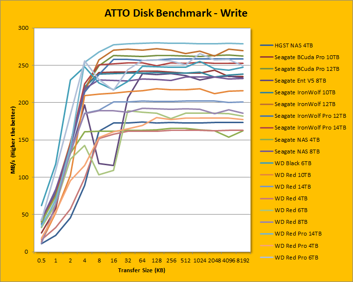 Following up next is our usual ATTO read and write tests. ATTO is an often-quoted benchmark, because it is easy to use and accurate. For the most part, it is a favorite among reviewers and I have grown to embrace it as much as the next for the last little while. By varying the file transfer size, you can visually see how each product performs across the curve. In the Read section, the Western Digital Red Pro WD141KFGX 14TB performed exceptionally; taking home the crown in the fastest peak read and write speeds ever recorded here at APH Networks. Its ramp up speed profile was slightly slower than the Seagate IronWolf Pro ST14000NE0008 14TB up to 4K though. The WD141KFGX reached close to peak rate at 4K and above, which was quite quick. Its peak read rate came in at 278.247MB/s, which was ahead of the IronWolf Pro 14TB at 255.652MB/s. In the Write section, it also reached its peak rate at 4K and above. With a top write speed of 280.189MB/s, this, again, was incredible; ahead of the IronWolf Pro 14TB at 258.732MB/s. It still could not beat the WD Red Pro 6TB and Black 6TB in ramp up speed though.