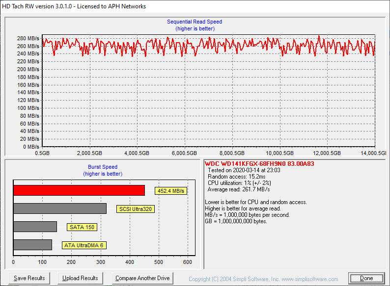 Now, it is the time for good old HD Tach. While HD Tach is more of a drag race than a clear indication of real life performance and has been around for a really long time, it is an excellent storage performance reference between hard drives for more than a decade. Back in the days, if your average speed exceeded 60MB/s, you had a seriously fast drive. Where does the Western Digital Red Pro WD141KFGX 14TB come in? With an average read speed of 261.7MB/s and tested random access time of 15.2ms, the read speed is mind-blowingly fast for mechanical hard drive, but the random access time leaves a bit to be desired. It is a virtual tie with the Seagate's IronWolf Pro ST14000NE0008 14TB at 255.3MB/s, but the IronWolf Pro only had an 8.1ms access time. Meanwhile, the Red WD140EFFX 14TB had an average read speed of 227.7MB/s and tested random access time of only 8.6ms. I am not sure why the WD141KFGX's random access time is so much higher, but it is consistent with other programs we have used.