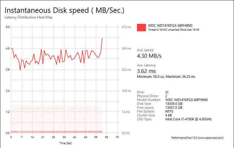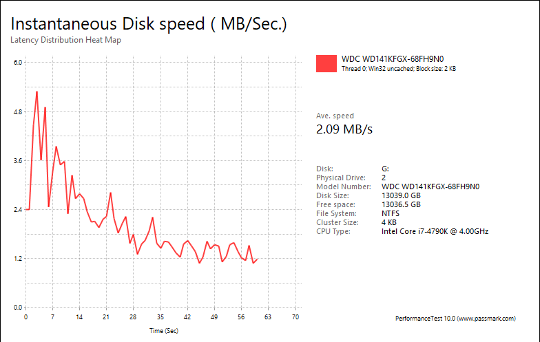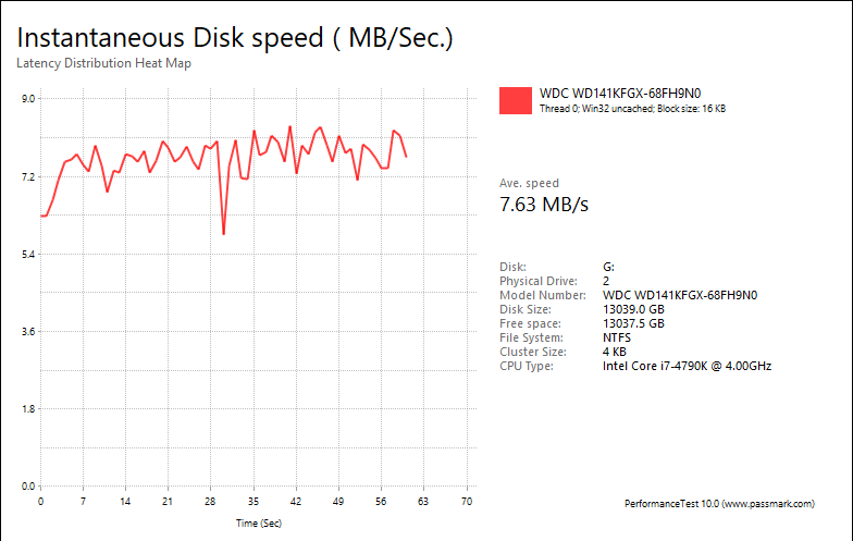 Overall, the Western Digital Red Pro WD141KFGX 14TB's performance was very good compared against other hard drives in the category. With results of 2.09MB/s, 8.26MB/s, 7.63MB/s, 4.30MB/s, these are generally great numbers for mechanical hard drive other than the web server category. The fastest drive in this test on average is still the Seagate IronWolf Pro ST14000NE0008 14TB at 1.71MB/s, 8.21MB/s, 13.93MB/s, 4.13MB/s, respectively. Meanwhile, Western Digital's Red WD140EFFX 14TB came in at 3.68MB/s, 8.34MB/s, 7.55MB/s, 4.01MB/s, respectively.