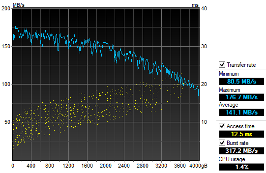 Unfortunately, HD Tune does not generate any fancy independent graph outputs in particular, so I had to edit my screenshot out a bit to make it look better for publishing in a review. Its numbers differ slightly in magnitude than the other program -- probably due to testing algorithms used -- but its performance characteristics are identical in practice. What is different from our HD Tach results on the previous page is the Western Digital Red Pro actually came in first, edging out the Seagate by a hair. This was followed by Hitachi's Deskstar NAS, and the Western Digital Red in fourth. As you can see in our screenshot above, the Western Digital Red Pro WD4001FFSX 4TB scored an average of 141.1MB/s with random access time of 12.5ms, while Seagate's NAS HDD ST4000VN000 4TB posted a score of 139.3MB/s at 17.9ms in the same test. The Western Digital Red WD40EFRX 4TB's numbers are 120.9MB/s and 16.8ms, respectively. Again, the Hitachi Deskstar NAS 4TB's 132.2MB/s sequential read average was not the highest, but it did come in with the second best random access delay of 15.5ms, behind the WD Red Pro.