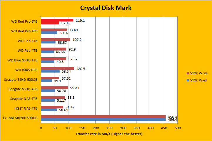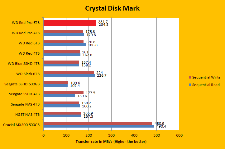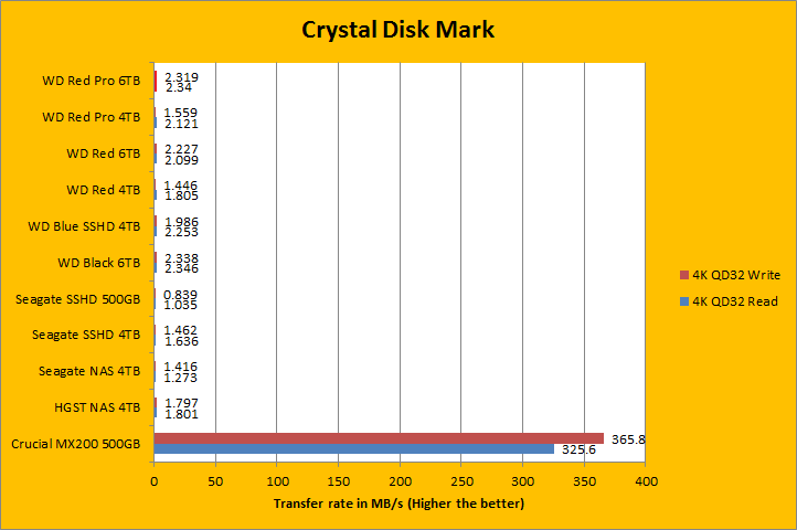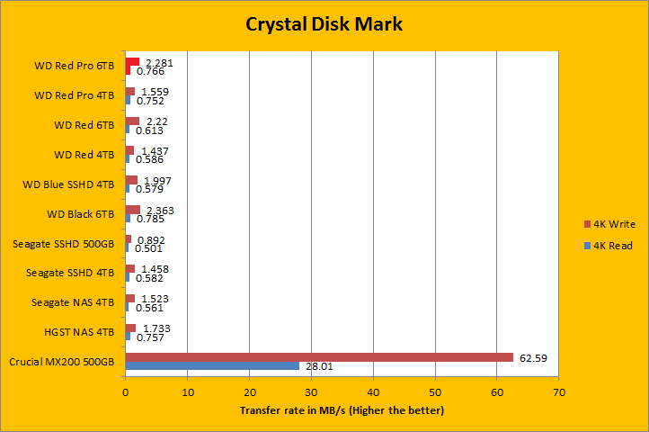 Crystal Disk Mark 3.0 is in the spotlight. Crystal Disk Mark is an important benchmark, because it tests the input/output operations per second capability of the storage device. As you can see in our charts above, compared against a few select drives; namely, hard drives from HGST, Seagate, and Western Digital, along with a mainstream MX200 500GB SSD from Crucial, the 7,200RPM Western Digital Red Pro WD6001FFWX 6TB was a star once again. It was obviously no contest against the Crucial SSD, but neither is the SSD's capacity against this 6TB monster. For a drive of this caliber, these results were excellent, where it was reminiscent of the Black 6TB, another 7,200RPM drive with five 1.2TB platters from Western Digital. Like all HDDs in the presence of an SSD, it was blown away in the 4K and 4K QD32 results. That said, the WD6001FFWX posted class leading results, along with its Black 6TB cousin, in these areas compared to other mechanical disks; delivering a noticeable advantage over everybody else. Generally speaking, we can see while the WD Red Pro 6TB performs a little better in linear tests, in a case where high IOPS are needed, the WD Black 6TB retains the performance crown. I will let you take a look at the results in our comparison graphs above.