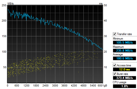 Unfortunately, HD Tune does not generate any fancy independent graph outputs in particular, so I had to edit my screenshot out a bit to make it look better for publishing in a review. Somewhat unlike our HD Tach results on the previous page, the line was standard fare for a hard drive -- faster near the beginning, and slowly drops off as we move away from the center of the platter. It differed slightly in magnitude than the other program as well -- probably due to testing algorithms used -- but its performance characteristics is really identical in practice. Other than that, the results were excellent across the range for a drive of this caliber; peaking at 180.6MB/s and holding a minimum of 105.5MB/s. Do keep in mind the discussion we had on the previous page, as it still applies here.