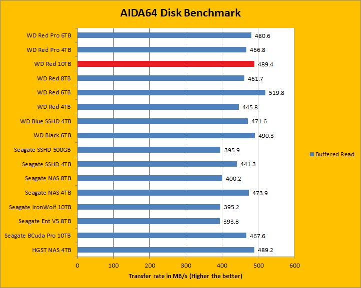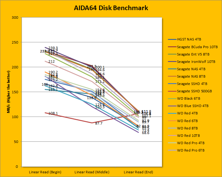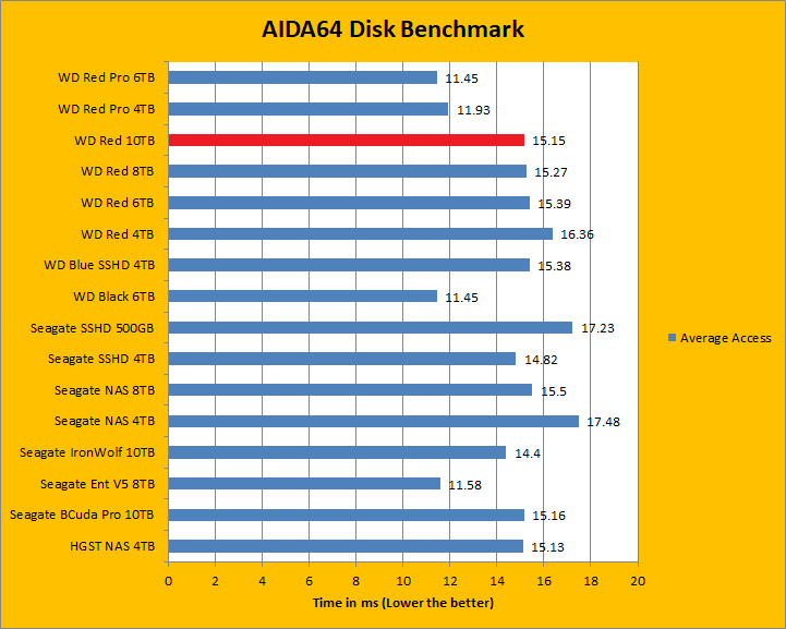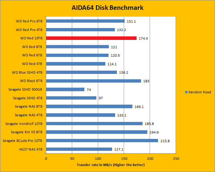 Since our storage review benchmark results are presented in alphabetical order, first up on the list are results from one of our favorite benchmarking programs, AIDA64 Engineer. Just to note, AIDA64 Engineer is a full synthetic benchmark. Unlike full synthetic motor oil, this usually does not always carry a good connotation. While it is not a representation of real life performance (Such as how fast you can copy movies to your drive), it does provide valuable insight into performance variation between drives from different manufacturers. As you can see in our graphs above, the latest 5,400RPM Western Digital Red delivered great performance in the linear read segment; a sizable increase compared to the 8TB model. It clocked in at 212.0MB/s in the beginning of the drive, 171.1MB/s in the middle, and finishing with 99.0MB/s in the end. That said, the 10TB WD Red also a comparable random access time to the 8TB model at 15.15ms. The 10TB WD Red was slightly slower than the Seagate IronWolf ST10000VN0004 10TB, but the IronWolf is a 7,200RPM drive.