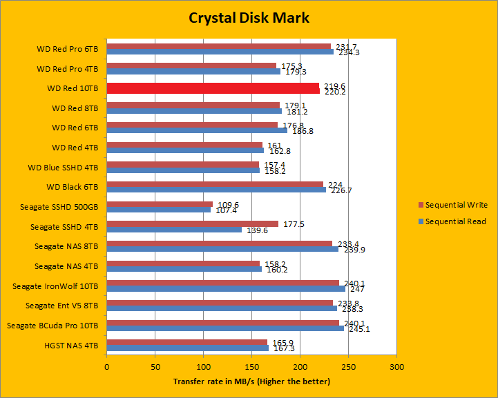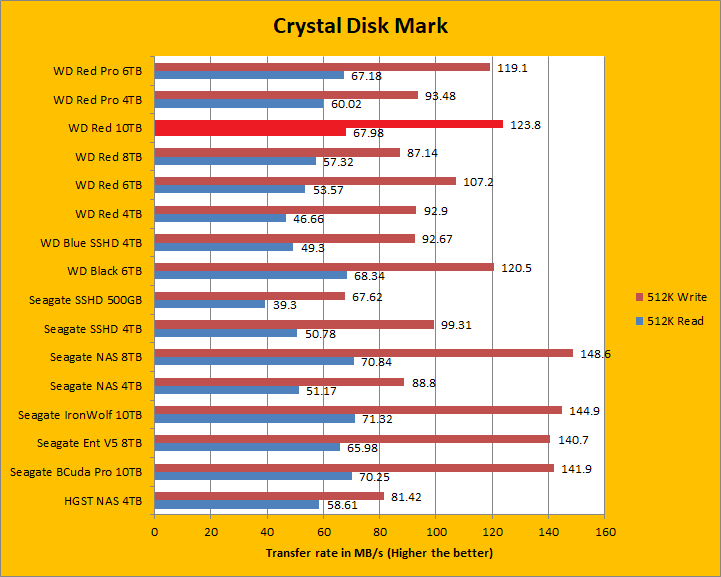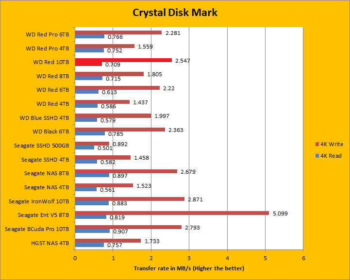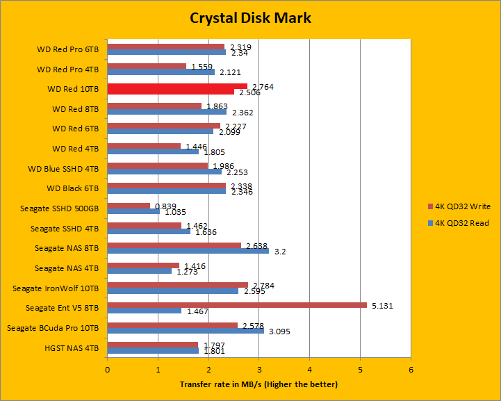 Crystal Disk Mark 3.0 is in the spotlight. Crystal Disk Mark is an important benchmark, because it tests the input/output operations per second capability of the storage device. As you can see in our charts above, compared against mainly drives from Seagate and even Western Digital themselves, the 5,400RPM Western Digital Red 10TB performed pretty well. For a drive of this caliber, these results were very good, where it consistently faster than the WD80EFZX. It won every read test other than the third one against its smaller brother, but only by a hair. Obviously, other drives that operate at a higher RPM had an advantage, such as the Seagate IronWolf ST10000VN0004 10TB. I will let you take a look at the results in our comparison graphs above.