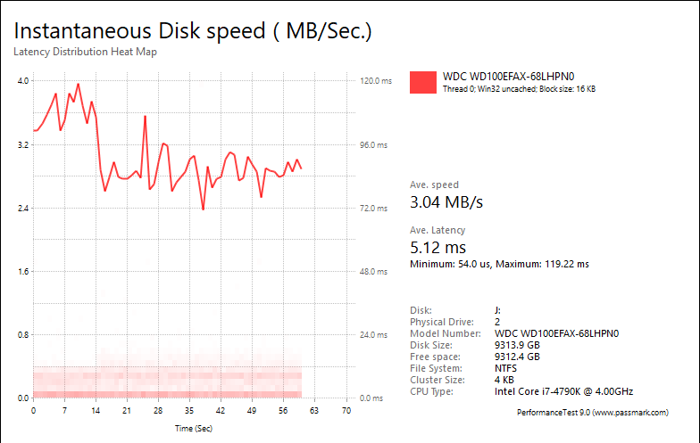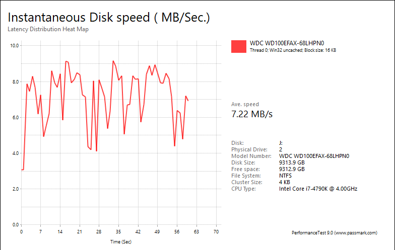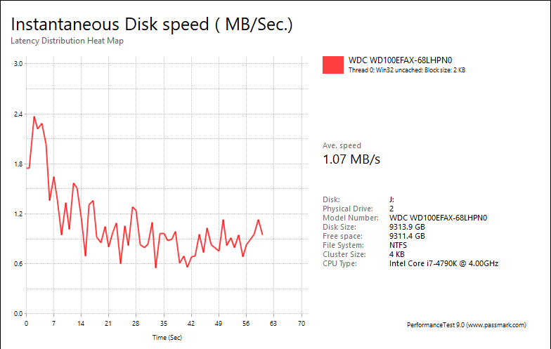 Overall, the Western Digital Red WD100EFAX 10TB's performance was respectable compared against other hard drives, but not necessarily ground-breaking. With results of 1.07MB/s, 7.22MB/s, 6.86MB/s, 3.04MB/s, most of these numbers were slower than the 8TB model with the exception of the Workstation test. The WD80EFZX posted numbers of 2.02MB/s, 8.84MB/s, 8.66MB/s, 2.75MB/s, in that order. The fastest drive I have ever seen in this test was the Seagate NAS HDD ST8000VN0002 8TB at 1.25MB/s, 9.28MB/s, 11.32MB/s, 3.59MB/s, respectively. Meanwhile, Seagate's IronWolf ST10000VN0004 10TB came in at 1.19MB/s, 5.51MB/s, 9.59MB/s, 3.63MB/s, respectively.