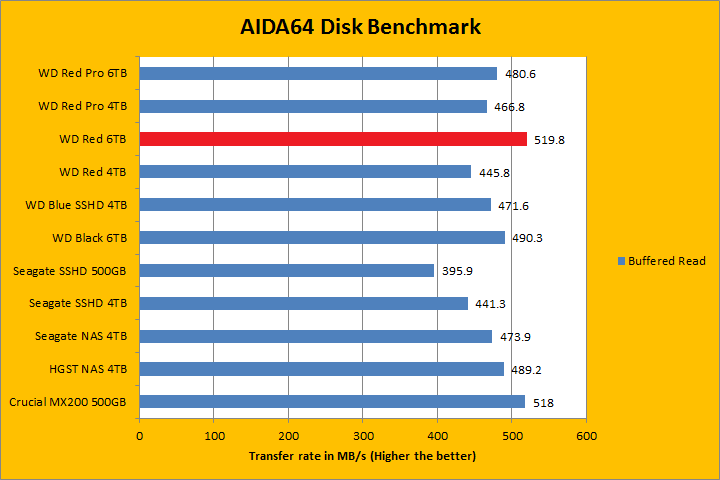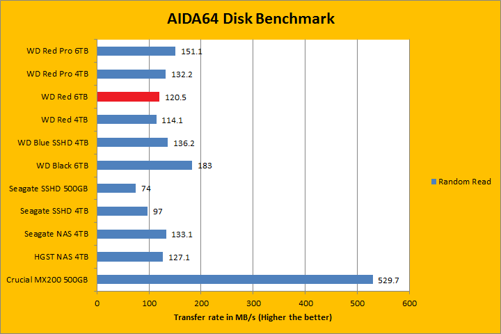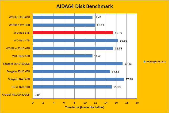 Since our storage review benchmark results are presented in alphabetical order, first up on the list are results from one of our favorite benchmarking programs, AIDA64 Engineer. Just to note, AIDA64 Engineer is a full synthetic benchmark. Unlike full synthetic motor oil, this usually does not always carry a good connotation. While it is not a representation of real life performance (Such as how fast you can copy movies to your drive), it does provide valuable insight into performance variation between drives from different manufacturers. As you can see in our graphs above, the latest 5,400 RPM Western Digital Red delivered great performance in the linear read segment; delivering a sizable improvement over the 4TB model. It clocked in at 190.2MB/s in the beginning of the drive, 143.6MB/s in the middle, and finishing with 81.8MB/s in the end. This is 10-15% faster than the lower capacity model. Unsurprisingly, the 6TB WD Red also reported a lower random access time than the 4TB model at 15.39ms.