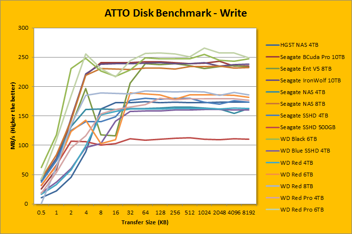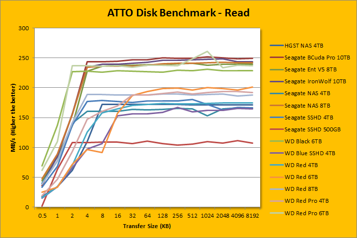 Following up next is our usual ATTO read and write tests. ATTO is an often quoted benchmark, because it is easy to use and accurate. For the most part, it is a favorite among reviewers, and I have grown to embrace it as much as the next for the last little while. By varying the file transfer size, you can visually see how each product performs across the curve. In the Read section, the Western Digital Red WD80EFZX 8TB was quite competitive. Its ramp up to 16K was a significant improvement over its 4TB and 6TB counterparts. On the other hand, it pulled lower peak rates than the 6TB model, although it was faster than the 4TB variant. This came in at 189.483MB/s, which was better than the WD40EFRX at 174.308MB/s, but not the WD60EFRX at 201.075MB/s. In the Write section, its initial ramp up was quite similar to the WD60EFRX, but posted a sizable lead between 4K and 16K. With a top write speed of 192.533MB/s, this, was better than both the WD Red 4TB and 6TB.