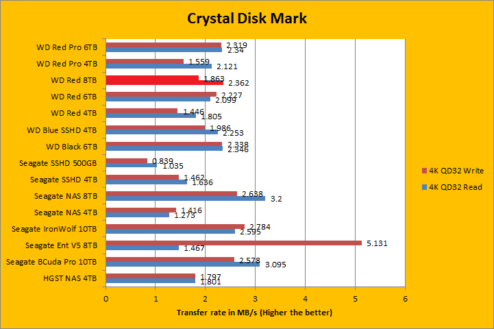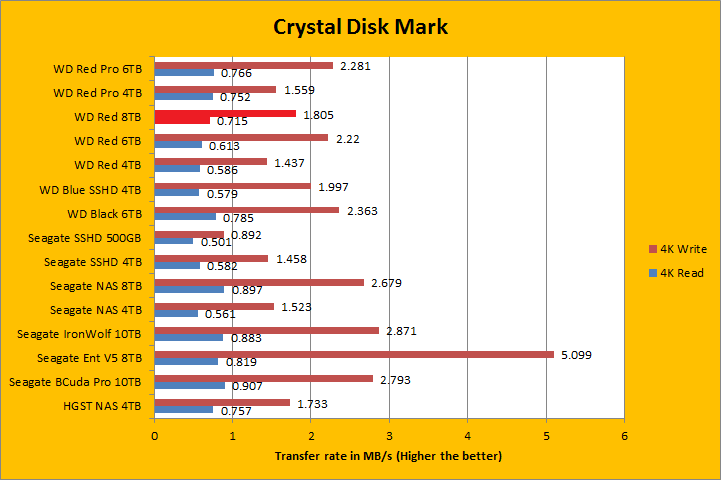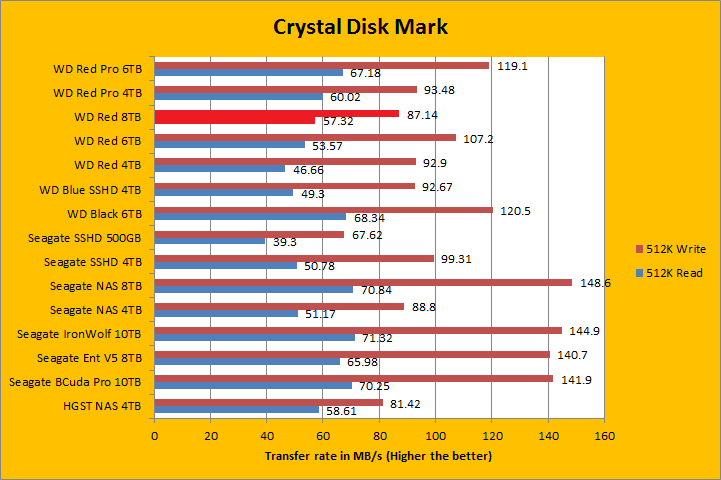 Crystal Disk Mark 3.0 is in the spotlight. Crystal Disk Mark is an important benchmark, because it tests the input/output operations per second capability of the storage device. As you can see in our charts above, compared against mainly drives from Seagate and even Western Digital themselves, the 7,200RPM Western Digital Red 8TB performed pretty well. For a drive of this caliber, these results were very good, where it traded blows with the WD60EFRX repeatedly. It won almost every read test other than the first one against its smaller brother, but its fate reversed in the write section. Overall, the Seagate NAS HDD ST8000VN0002 8TB had a performance advantage. I will let you take a look at the results in our comparison graphs above.