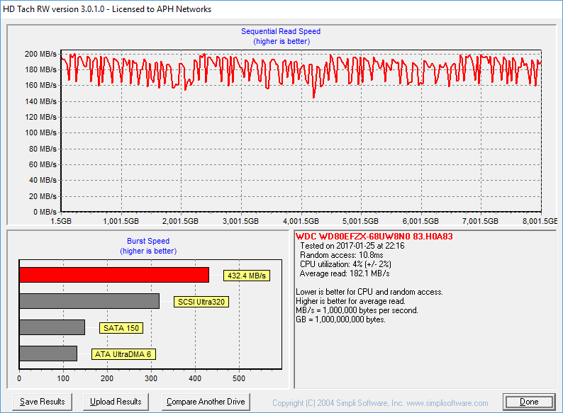 Now, it is the time for good old HD Tach. While HD Tach is more of a 'drag race' than a clear indication of real life performance, and has been around for a really long time, it is an excellent storage performance reference between hard drives for more than the last decade. Back in the days, if your average speed exceeded 60MB/s, you have a seriously fast drive. Where does the Western Digital Red WD80EFZX 8TB come in? With an average read speed of 182.1MB/s and tested random access time of 10.8ms, this is pretty fast for a mechanical hard drive, but it spins at 7,200RPM. But how does it compare against the competition? The 7,200RPM Seagate NAS HDD ST8000VN0002 8TB came in at 242.3MB/s, and the Enterprise Capacity 3.5 HDD V.5 8TB came in at 240.6MB/s. For 6TB drives, the Red WD60EFRX clocked in at 176.5MB/s, and the Red Pro WD6001FFWX pulled 227.6MB/s in the same test.