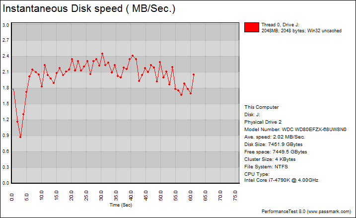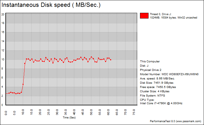 Overall, the Western Digital Red WD80EFZX 8TB's performance was respectable compared against other hard drives, but not necessarily ground-breaking. With results of 2.02MB/s, 8.84MB/s, 8.66MB/s, 2.75MB/s, most of these numbers were a good improvement compared to the 6TB model, other than the Workstation test. The fastest drive I have ever seen in this test was the Seagate NAS HDD ST8000VN0002 8TB at 1.25MB/s, 9.28MB/s, 11.32MB/s, 3.59MB/s, respectively. Meanwhile, Seagate's Enterprise Capacity 3.5 HDD V.5 ST8000NM0055 8TB came in at 1.21MB/s, 7.03MB/s, 9.39MB/s, 3.84MB/s, respectively. On the Western Digital side of things, the Red Pro WD6001FFWX posted numbers of 1.24MB/s, 8.91MB/s, 9.88MB/s, and 3.36MB/s, while the Red WD60EFRX came in at 0.89MB/s, 6.92MB/s, 7.61MB/s, and 3.13MB/s, in that order.