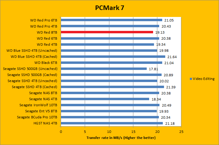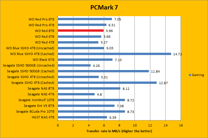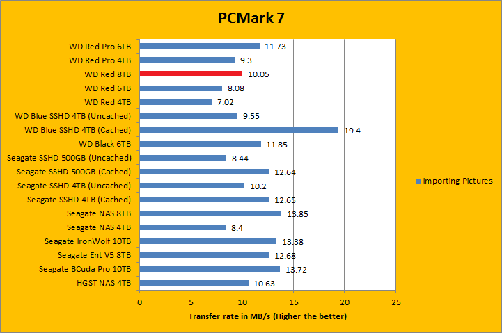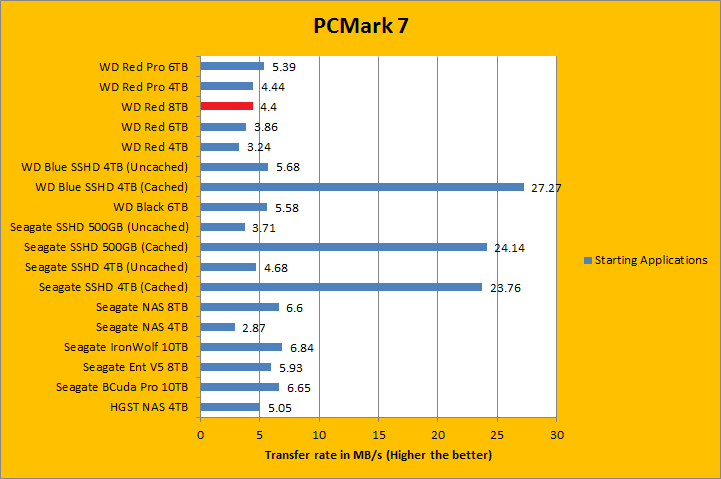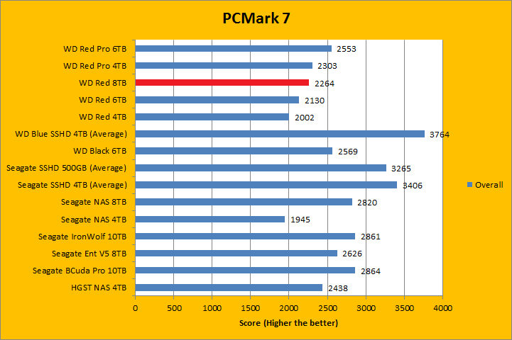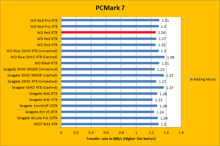 PCMark 7 aims to shed a little more insight into real life performance of your computer hardware by semi-synthetic means -- and all insight is good, right? The great thing about standardized tests is anyone can repeat them and get very similar results, given identical hardware. PCMark 7 is a Windows desktop environment based test, which is exactly what we are after. Also, we can see some caching going on between iterations, which allowed us to see what kind of boost some of the SSHDs in this test brings to the table. Well, I am not going to narrate the stuff above in detail, because we all know graphs are there for a very good reason. As you can see in our results above, the WD80EFRX was slightly faster than the WD60EFRX, which in turn was slightly faster than the WD40EFRX, but it was held it back from beating other 7,200RPM models like the Seagate NAS HDD 8TB. It still consistently held its own among other hard drives in each simulation segment, which was very commendable overall.