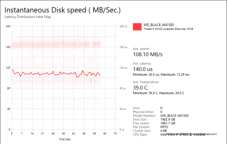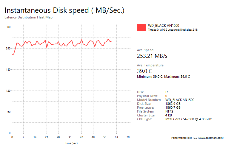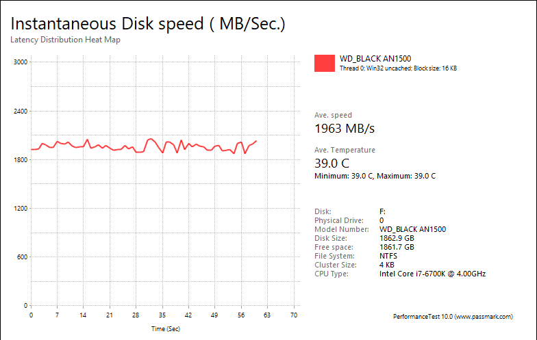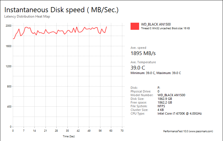 PassMark PerformanceTest 10's Advanced Disk Test, unlike HD Tune Pro 5.70, generates some awesome graphs right out of the box. It also provides valuable insight in simulating real world performance applications. To make things clear to you, the first graph simulates a database server, followed by a file server, web server, and workstation. Obviously, PassMark PerformanceTest 10 uses highly compressible data in most tests some controllers can really take advantage of. However, it also requires high IOPS capabilities for the best score. One thing clear is the Western Digital WD_BLACK AN1500 2TB provided generally flat graphs, which is excellent if you are looking for consistent performance.