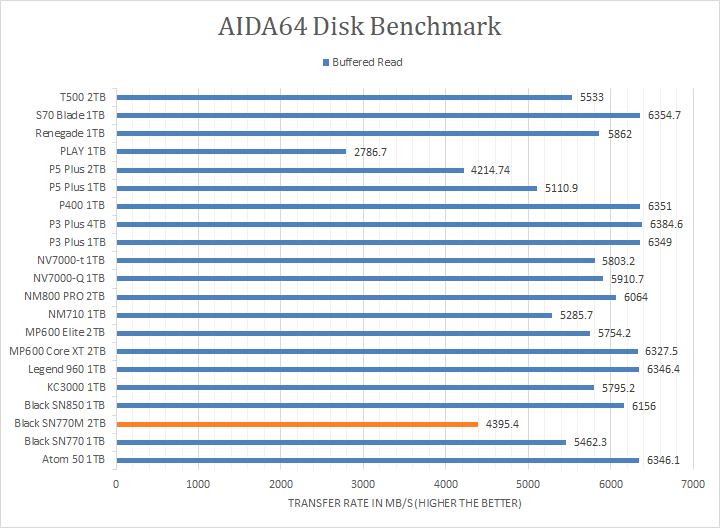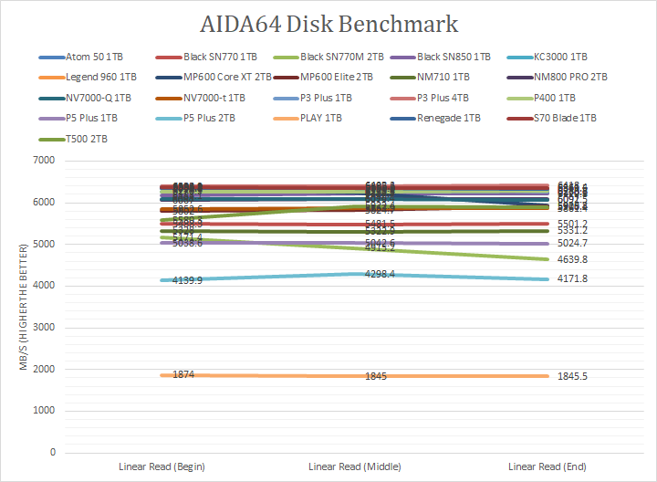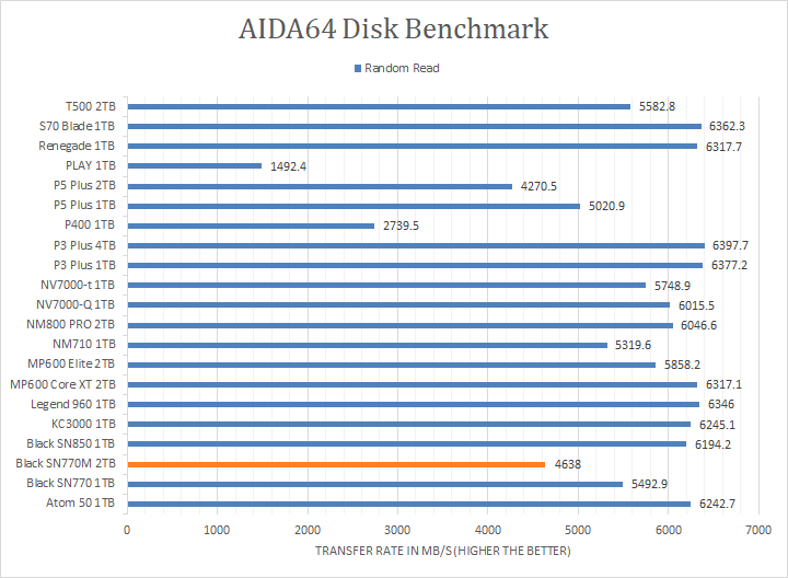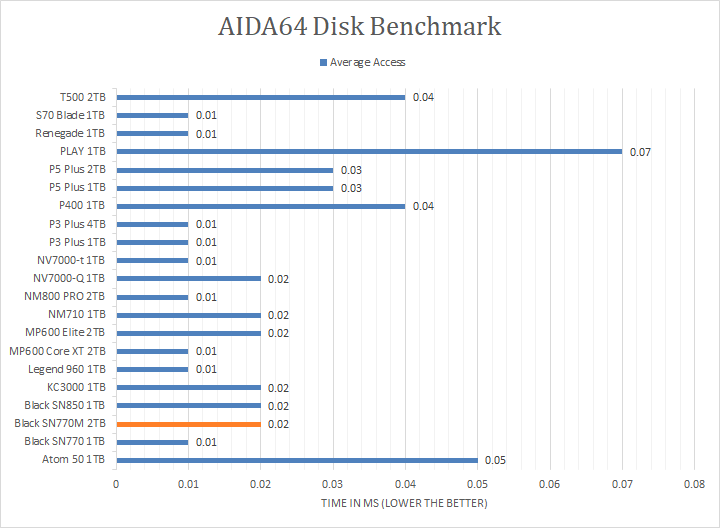 Since our SSD review benchmark results are presented in alphabetical order, first up on the list are results from one of our favorite benchmarking programs, AIDA64 Engineer. Version 7.30.6900, the latest release at press time, can be downloaded from our Downloads page. Just to note, AIDA64 Engineer is a full synthetic benchmark. Unlike full synthetic motor oil, this usually does not always carry a good connotation. While it is not a representation of real-life performance -- such as how fast Photoshop opens -- it does provide valuable insight into performance between different drives and different controllers. As you can see in our graphs above, the WD_BLACK SN770M 2TB came in just below average compared to our large collection of compared SSDs. It scored consistently around the 4900MB/s mark in the linear read segment. The SN770M 2TB was about 700MB/s slower on average compared to the full-sized SN770, but way faster than the Lexar PLAY 1TB, which was in the 2000MB/s range. The tested latency was very low with an average of 0.02ms. The comparison results against all the other drives can be seen in our graphs above.
