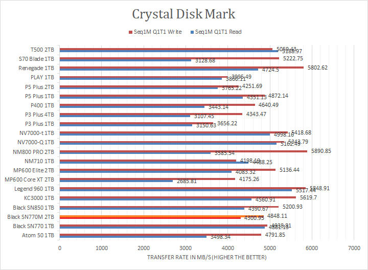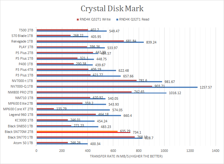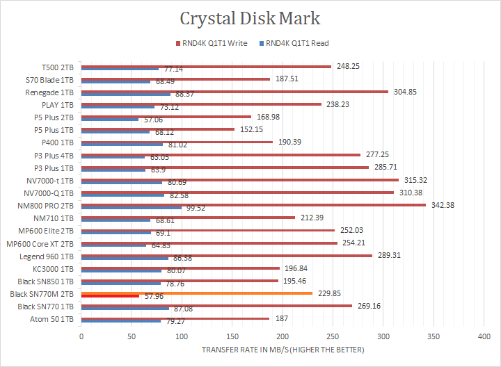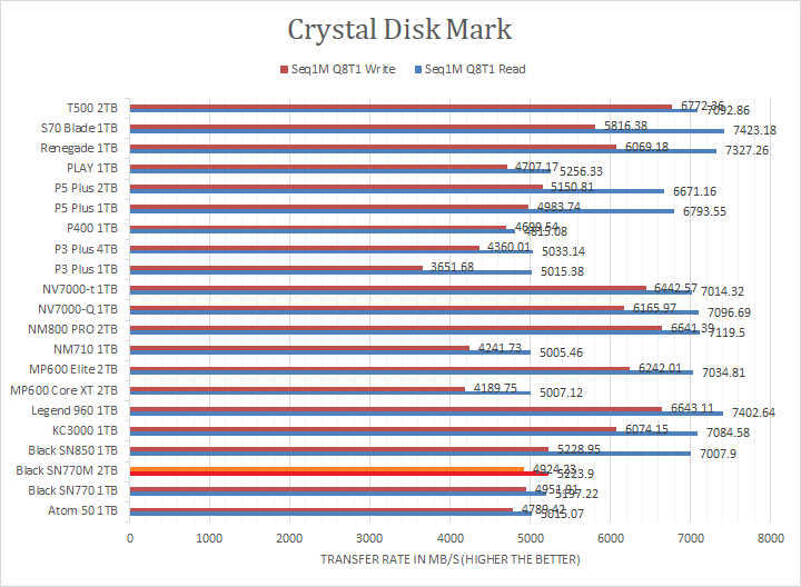 Western Digital claims the WD_BLACK SN770M 2TB's maximum read and maximum write are pinned at 5150MB/s and 4850MB/s, respectively. Looking at the read and write results, the SN770M 2TB was about mid-tier in the sequential read and write sections against other PCIe 4.0 NVMe drives, but this was to be expected per the specifications. The tested numbers were pretty close compared to the advertised numbers. It continued to perform reasonably well for its performance class, staying just behind the SN770 and delivering significantly better results than the Lexar PLAY in every test except for the RND4K Q1T1 test. Overall, the WD_BLACK SN770M 2TB punches strongly for a compact budget performance SSD. I will let you make your own comparisons in our list of NVMe SSDs in the graphs above.