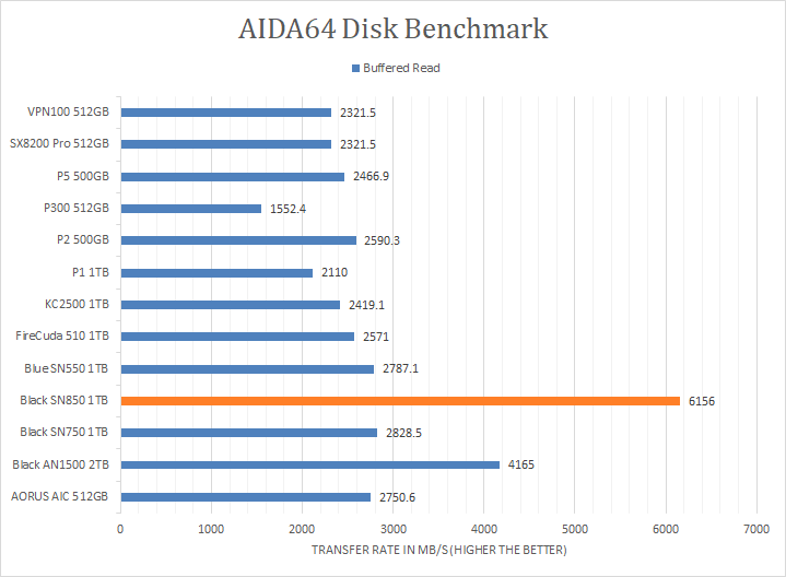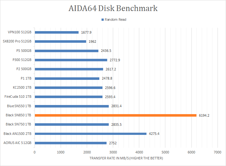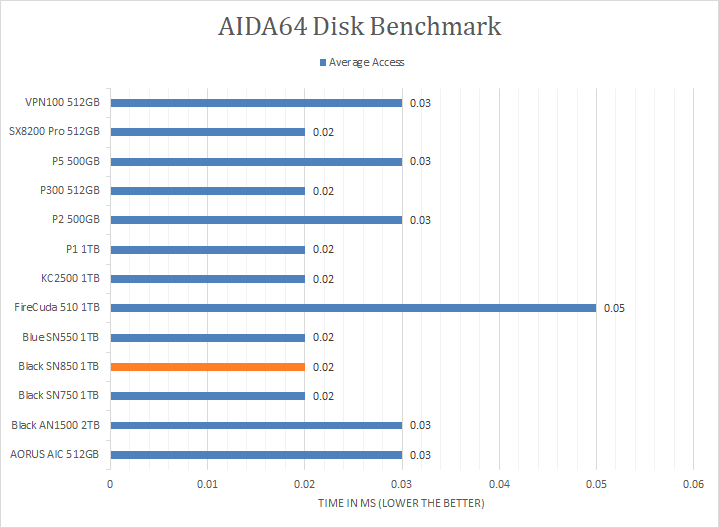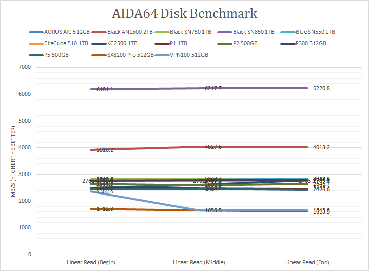 Since our SSD review benchmark results are presented in alphabetical order, first up on the list are results from one of our favorite benchmarking programs, AIDA64 Engineer. Version 6.33.5700, the latest release at press time, can be downloaded from our Downloads page. Just to note, AIDA64 Engineer is a full synthetic benchmark. Unlike full synthetic motor oil, this usually does not always carry a good connotation. While it is not a representation of real-life performance -- such as how fast Photoshop opens -- it does provide valuable insight into performance between different drives and different controllers. As you can see in our graphs above, the WD_BLACK SN850 NVMe SSD 1TB absolutely dominated all other compared drives. It scored consistently around the 6200MB/s mark in the linear read segment. The tested latency was very low with an average of 0.02ms. The rest of the comparison results against all the other drives can be seen in our graphs above.