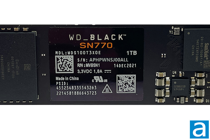 The Western Digital WD_BLACK SN770 NVMe SSD 1TB is a very simple looking SSD, both in appearance and physical layout. It comes with no heatsink, so all the components are exposed, as shown in our photo above. The label on the WD_BLACK NVMe SSD is placed between the components and gives it the branding and information such as its model name, capacity, serial number, and manufacturing date. I would much prefer a full-size label for looks, but most motherboards have an included heatsink for PCIe 4.0-based drives anyway.
